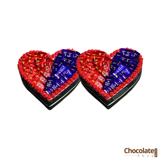 Delight your loved ones with the Chocolate Mix Premium Gift Pack A5 featuring a luxurious 12-inch heart-shaped hamper packed with Cadbury Dairy Milk 13gm 30pcs and Nestle KitKat 2 fingers mini 24pcs. Perfect for sharing joy, celebrating moments, or treating yourself to a wholesome chocolate experience.